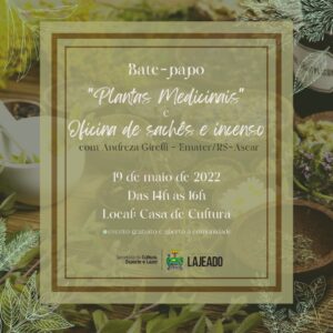 A Casa de Cultura de Lajeado, em parceria com a Emater/RS – Ascar, realiza o bate papo sobre “Plantas Medicinais” e a oficina de produção de sachês e incenso com diversas ervas. A atividade ocorre na quinta-feira, 19/05, das 14h às 16h, na Casa de Cultura. A oficina é gratuita e aberta a comunidade.