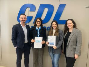 Os associados da CDL Lajeado agora podem adquirir um sistema de ponto eletrônico com reconhecimento facial com condições especiais. Isso porque a entidade assinou, na manhã desta quarta-feira (10), um convênio com a Iopoint, através do qual as empresas poderão adquirir a funcionalidade com valores diferenciados nos pacotes negociados. O acordo foi firmado pela presidente da CDL Lajeado, Giselda Hahn, e os representantes da empresa Narciso Dumke, Luise Trombeta e Giovana Trombeta.