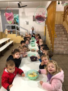 Para a atividade ficar ainda mais interessante para os alunos das turmas maiores, Ana Paula prepara uma surpresa. “Vamos fazer a dinâmica de adivinhação dos alimentos. Vendadas, as crianças vão precisar utilizar o tato e o paladar para identificar o que estão consumido”, resume.