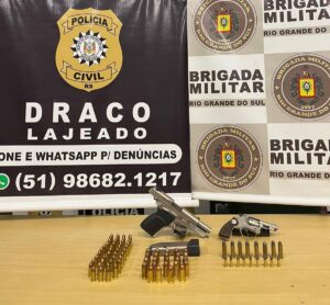 Nesta quinta-feira, (28), a Brigada Militar em ação conjunta com a Polícia Civil cumprido um Mandado de Busca e Apreensão no Bairro Jardim do Cedro, em Lajeado prendeu um homem, de 31 anos e apreendeu duas armas de uso restrito, marca Bersa, modelo minithunder, calibre .45, e um revólver marca Rossi calibre 22 e diversas munições. O indivíduo já possuía antecedentes criminais por dano, ameaça e fuga de local de acidente.