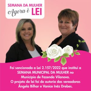 Foi sancionada ontem, (03) pelo prefeito municipal, projeto de Lei 2.157/2022, de autoria das vereadoras Ângela Bilhar e Vanice Inês Drebes, (PP), que instituiu a Semana Municipal da Mulher, no Município de Fazenda Vilanova.