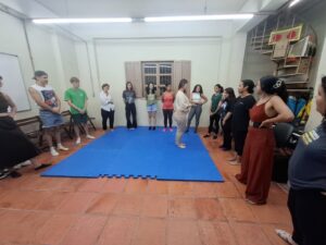 Já as oficinas de teatro ocorrem às terças-feiras e estão organizadas em quatro turmas: Infantil, Mista, Adultos I e Adultos II, contemplando diferentes faixas etárias e níveis de experiência.