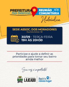 A Prefeitura de Lajeado realiza, nesta terça-feira, 30/09, a próxima edição do projeto “Prefeitura no Bairro – Reunião Comunitária” no bairro Hidráulica. O encontro será na Sede da associação de moradores, na rua Júlio Bohrer, número 191, e ocorre das 19h às 20h30. O encontro tem como objetivo apresentar os projetos da prefeitura para o bairro e ouvir as demandas da comunidade.