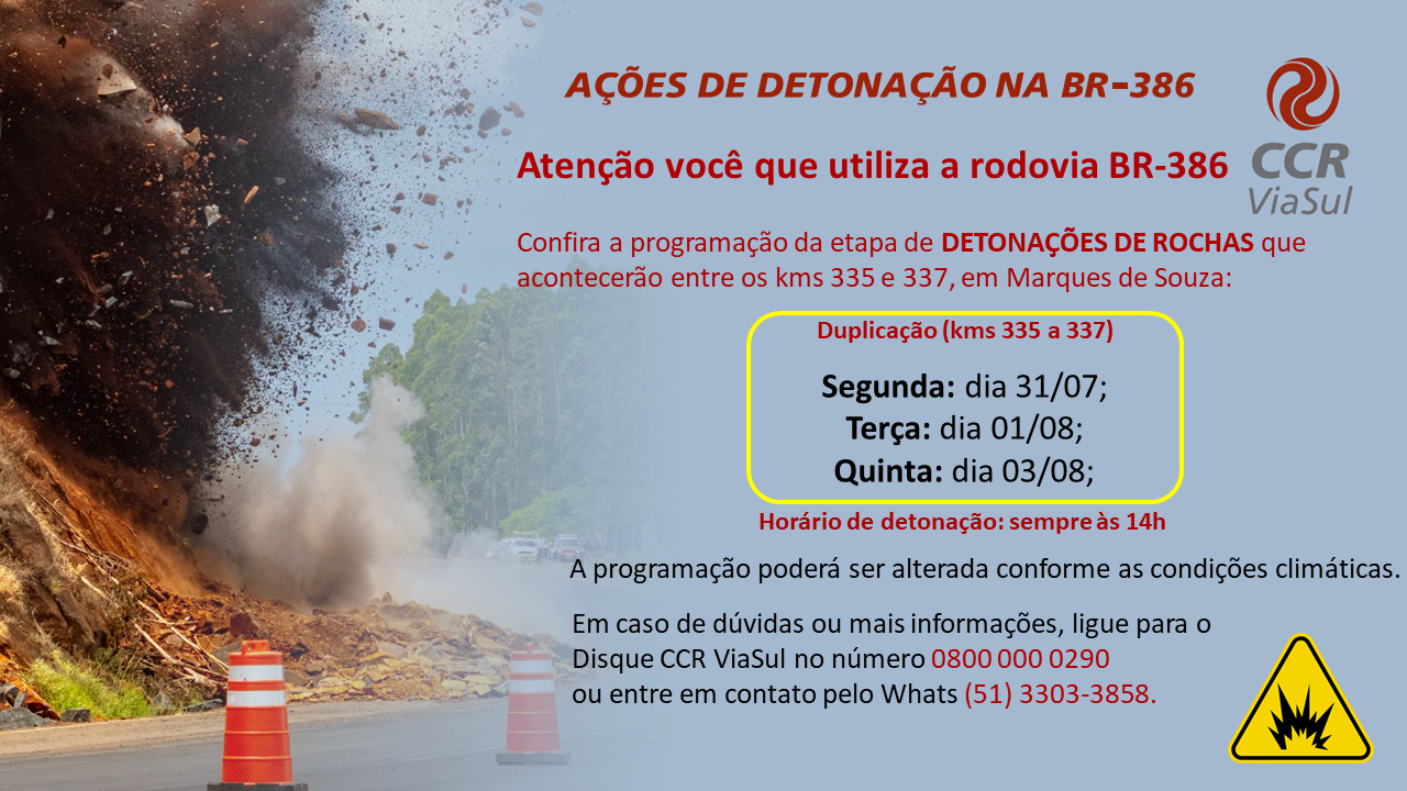 Motoristas que pretendem seguir pela BR-386 nesta semana devem estar informados sobre à programação de detonação de rochas da CCR ViaSul na rodovia, entre os
