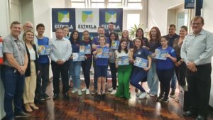 Em parceria do Governo de Estrela, através da Secretaria Municipal de Educação (Smed), e a Câmara de Vereadores, o projeto Vereadores Mirins foi retomado em 2022 após três anos de ausência A programação do projeto, que iniciou nas escolas com didáticas e a escolha dos vereadores, e que no último dia 30 de novembro contou com sessão comandada pelos 15 jovens, diante de um lotado plenário Bento Rodrigues da Rosa, culminou na tarde desta segunda-feira (19). Em cerimônia realizada na sede do Executivo estrelense, os vereadores receberam diplomas e as verbas para a execução dos projetos apresentados pelos mesmos.